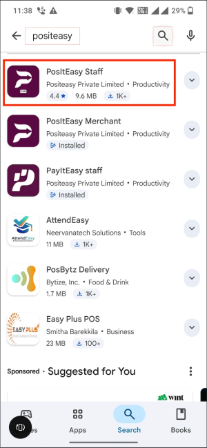 'Positeasy Staff' ऐप चुनें और Install बटन पर टैप करें।